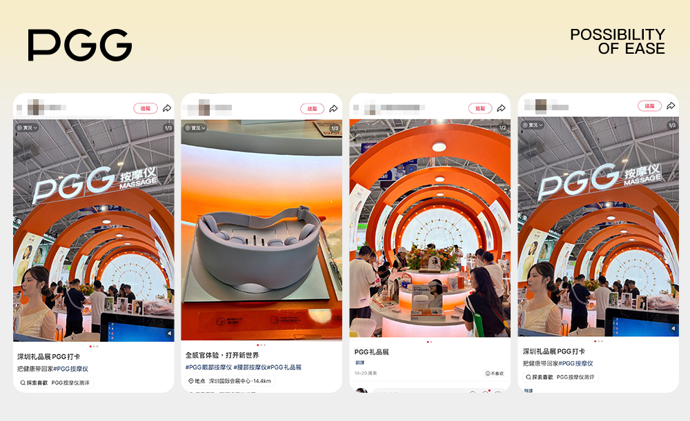 走进14号馆,PGG展位汇聚了来自各地的参观者与合作伙伴,专业交流氛围浓厚。真正让我们脱颖而出的是精心打造的“科技按摩体验官”互动打卡活动。未来感十足的按摩场景、产品光影互动墙等打卡点,成为不少观众记录分享的热门选择。许多用户在亲身体验我们的产品后,自发在社交平台分享感受,这种“体验即传播”的方式,不仅维持了展位现场的热度,也实现了品牌影响力的持续扩散。